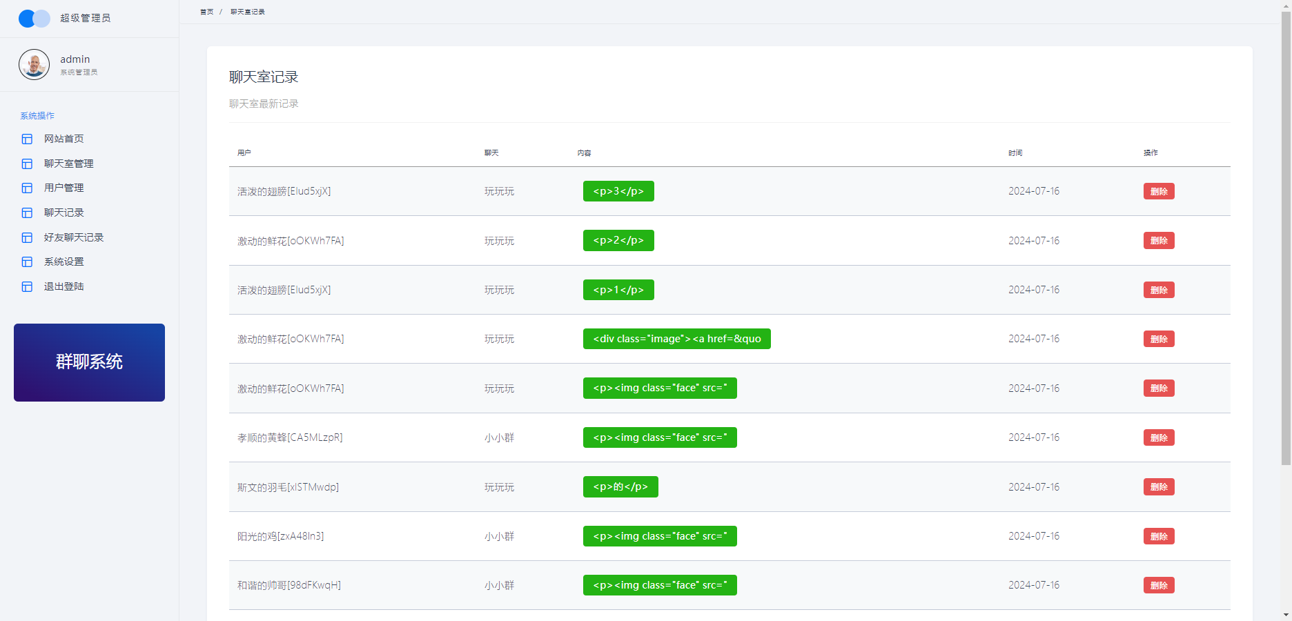 支持发送图片、表情包,后台可以查看所有聊天记录
